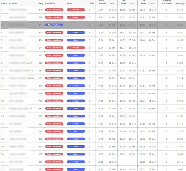 Trying to come to terms with fair selection for Zone Championships can take time. Especially in a large club when spots are limited. Club Manager can analyse your results for each event to rank athletes. You can even make selections and validate and report. Selections can then be exported to produce a file compatible with Meet Manager.